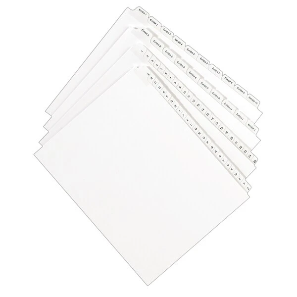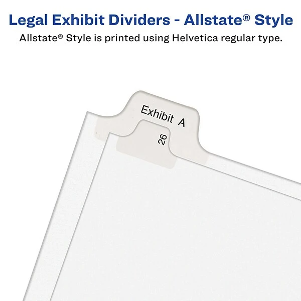 When you want disorganized files and unruly paperwork to cease and desist, turn to these Avery Collated Legal Dividers – Allstate(R) Style featuring Tabs EXHIBIT A-Z. Now you can bring order to index briefs, legal exhibits, mortgage documentation files, and more. Clear and durable Rip Proof(TM) reinforced tabs on white paper stock help you reference your documents with ease, and are conveniently preprinted on both sides using Helvetica regular type so you can find what you need in a flash. The binding edge is unpunched so they can fit practically any binding system, giving your files a clean and professional appearance. Your motion for clean and orderly files has been granted.