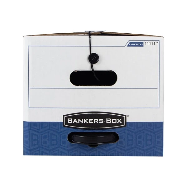 Keep files, papers and documents secure by storing them in these letter-size storage boxes. Each box features a string-and-button closure and a 3-inch seal that safely secures contents while protecting them from dirt and moisture. These Banker Box Liberty storage boxes come in a pack of 12 and have reinforced plastic handles, making them easy to grab.
