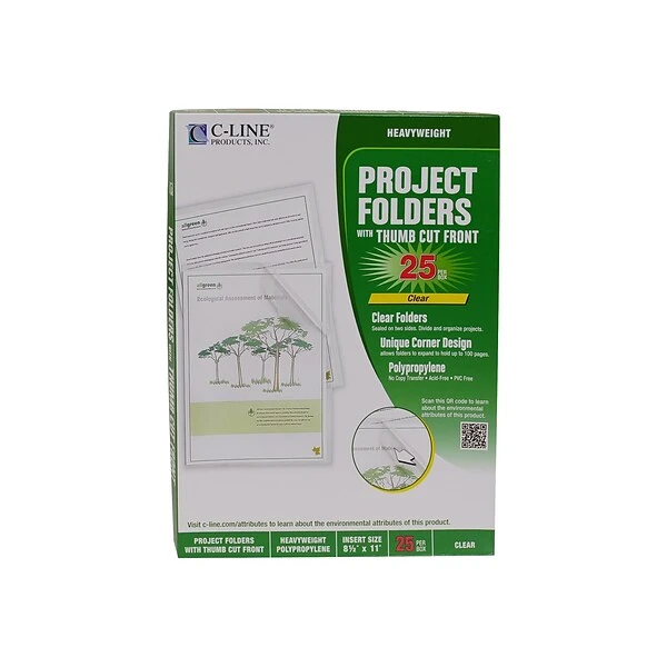 Safeguard documents when using these clear project folders. These letter-size folders open on two sides and have thumb notches in the front for easily accessing the pages inside. These C-Line folders are made from archival-quality, heavyweight propylene with an anti-glare finish to easily view the contents inside.