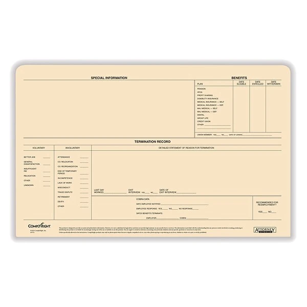 Even in today’s digital work environment, maintaining original employee records is necessary. The legal-size ComplyRight Confidential Personnel Envelo-File is ideal for safely storing employment applications, evaluation forms, warning notices and other employee paperwork. The smart design also allows you to record key information and benefits right on the folder, putting everything at your fingertips for greater convenience.