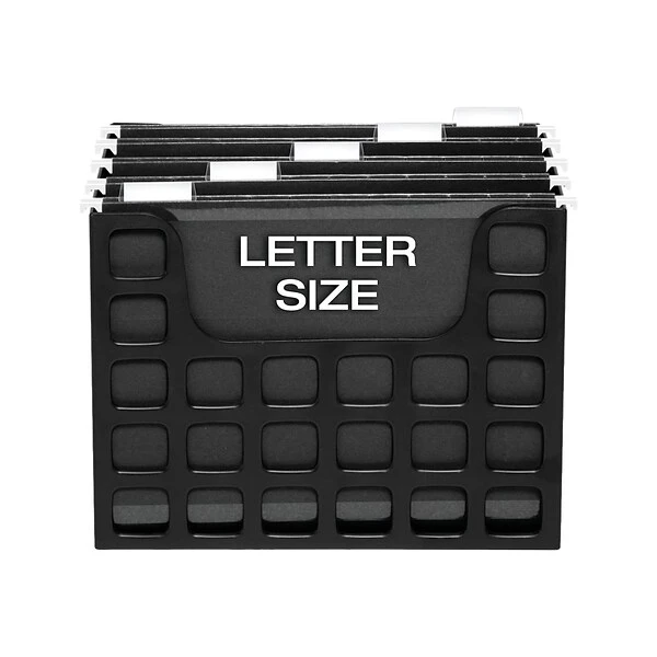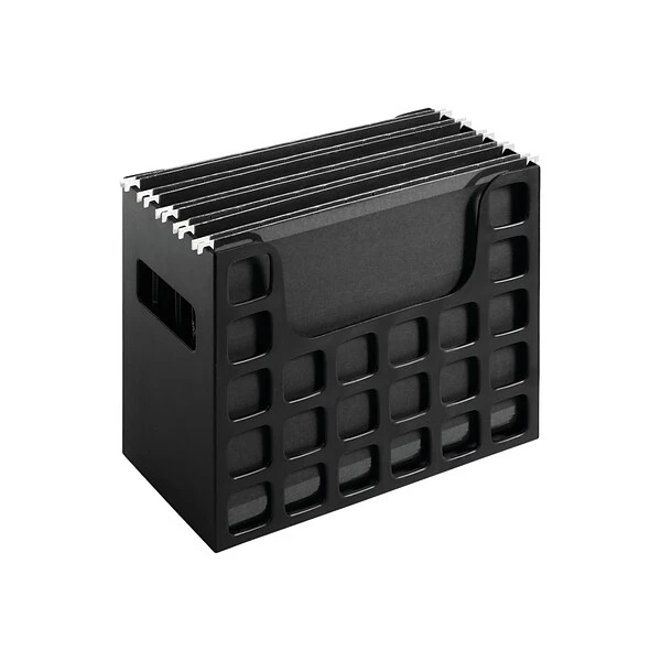 Expand your filing system with this black hanging file folder desktop storage unit. The high-impact plastic construction provides the durability necessary to stand up well to regular use. This Pendaflex DecoFlex hanging file folder desktop storage unit comes with five black hanging file folders completed with tabs and blank white inserts, so you have everything you need to file efficiently.