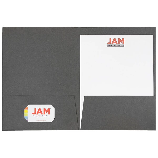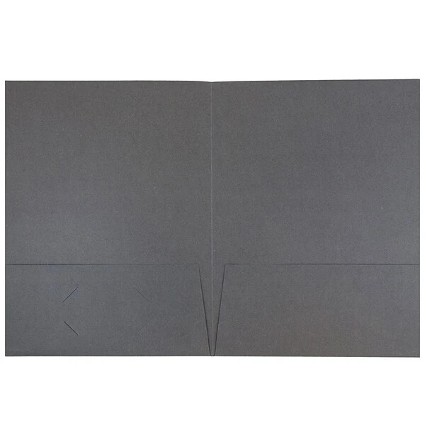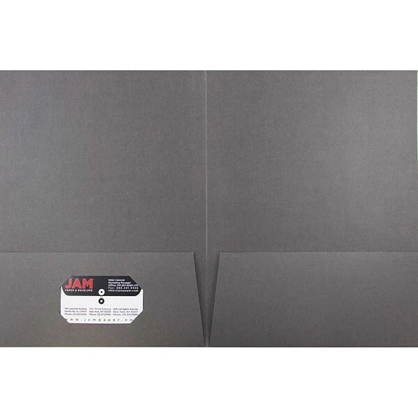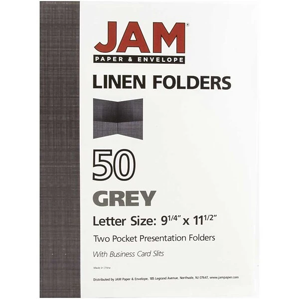 JAM Paper® Gray Linen Two Pocket Presentation Folders are made out of heavy duty 100lbs. card stock and measure a convenient 9 x 12 inches in size, which makes them ideal for standard sized sheets of paper. These folders are sold in packs of 100. Each one features two pockets on the inside along with a business card slot on the left side pocket. These folders are a beautiful and sophisticated smoky gray color and have a refined linen finish. This combination gives them a classy and professional appearance that looks fantastic in any professional or academic setting. Use these folders to store and organize your documents and to carry them from place to place.