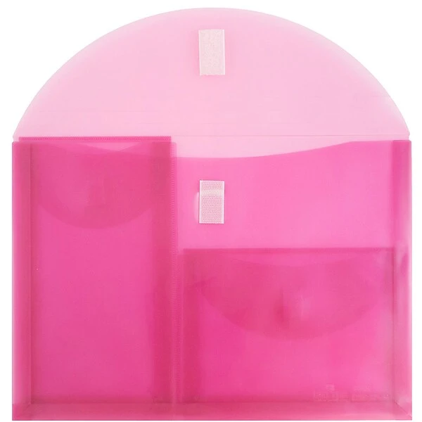 JAM Paper® Pink 3 Pocket Plastic Letter Booklet Sized Expansion Envelope with certified VELCRO® Brand closure is 9.75in x 13 in size and has a 1 inch expansion. This envelope has a full sized pocket that opens on one side and two smaller pockets on the other. These smaller pockets are 5.5 x 725 inches and 5 x 9 inches in size. Store and protect documents, files, notes, business cards, pens and markers all in one unit with a pocket perfectly sized for each of them! Each pocket has a certified VELCRO® Brand closure for secure closing and simple opening. The pliable, yet sturdy poly plastic material of this envelope will protect your papers and items from bending, ripping, scratches, stains and other damage. Its cherry blossom pink color is sure to bring some joy and motivation to your workday! (Sold Individually)