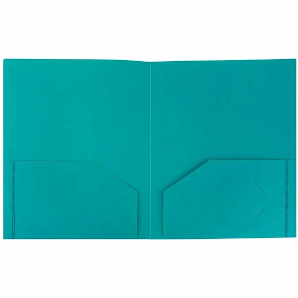 Looking to bring some color to your office? Could you use some extra recourses to keep documents organized and safe as well? JAM Paper® Teal Blue Heavy Duty Plastic Two Pocket Presentation Folders measure 9 x 12 inches in size and contain two pockets on the inside. Each right-side pocket features a convenient business card slot for displaying your business and professional information with ease. These folders are made out of notably durable, heavy duty plastic and will guard your important documents against dust, dirt, and damage. The inviting teal color of these folders is sure to add a bright and welcome accent to your work space. This pack includes 6 folders!