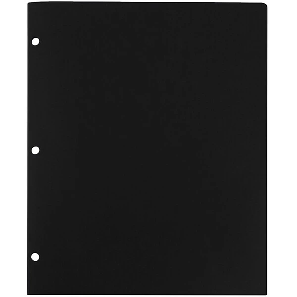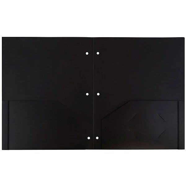 JAM Paper® Black Plastic Two Pocket 3 Hole Punched Presentation School Folders are 9in x 12 inches in size and are made out of heavy duty, pliable plastic. In this pack, a total of 6 folders is included. On the inside, each of these folders has two pockets. The right side pocket features two slots for business card slots and other small documents. Each folder has three holes in a vertical row on the left the side for placing and securing them into binders. These folders have a jet black color that gives them a versatile and professional edge. Use them in any school or office setting to organize documents and to keep them safe from damage.