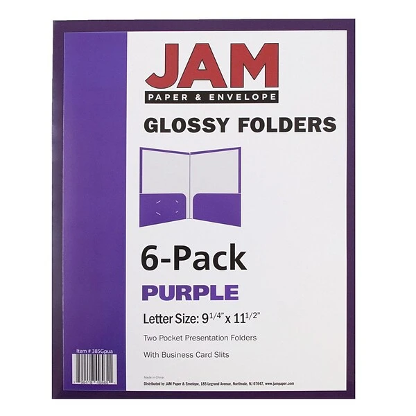 JAM Paper® Purple Glossy Two Pocket Presentation Folders will bring elegant and royal, yet fun and expressive look to your office or study area! These folders measure 9 x 12 inches each, which makes them ideal for standard 8 x 11.5 sheets of paper. Made of durable 80lb cardstock, these folders are ideal for storing and organizing documents and for bringing them on the go. This pack includes an even total of 6 folders. Each one contains two pockets on the inside. There is a business card slot featured on the left side pocket. If you love purple and want to bring a new degree of order to your work or academic notes and papers, these glossy folders are for you!