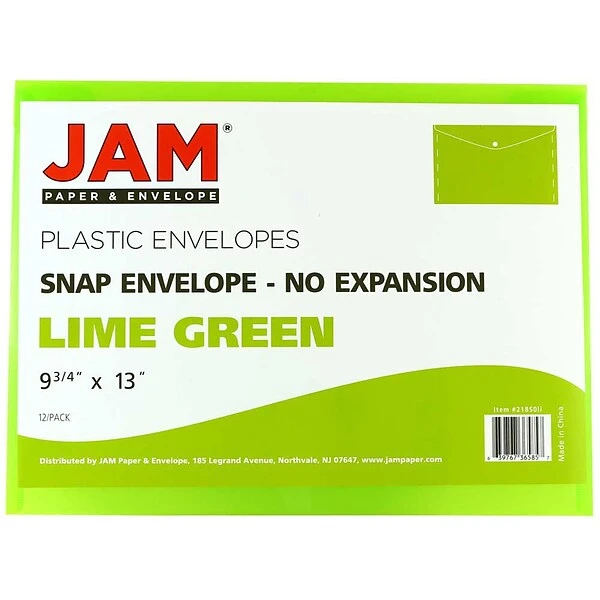 JAM Paper & Envelope’s Letter Booklet Plastic Snap Closure Envelopes are designed to hold and carry standard size documents. Made from smooth semi-translucent plastic, these envelopes are water, scratch and tear resistant, constructed to safely secure a nd protect important documents from the elements. They measure 9 3/4 x 13 inches, fitting documents on their horizontal side, and include a Snap closure, intended to help seal and secure papers. The button snap easily pulls apart yet is secure enough to keep your documents neat, in place and organized. Their size also makes these envelopes very practical; they easily fit in most filing drawers, desk organizers, shelves, or in bags and briefcases if you need them while on the go. Great to use for organ izing papers, documents, memos, presentations, marketing materials and more. Easily fits standard documents (8.5 x 11 inches) and smaller items. Sold in packs of 12. This Letter size booklet plastic envelope comes in the color Lime Green.