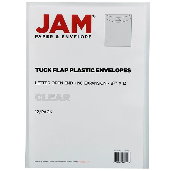 JAM Paper® Clear Letter Open End Plastic Envelopes with Tuck Flap Closures are 9 7/8 x 11 3/4 inches in size and come in packs of 12. They are completely transparent and are made of thin, durable plastic. Their tuck flap closures are composed of a rounded tab on the top the flap opening that tucks in to a slit in the front of the envelope for secure closing and easy opening. They are perfect for work documents, legal documents, school, projects, portfolios or any documents of standard size. Use them to store papers in a desk or on a shelf. Place them in briefcases or bags to keep your papers safe while in transport. Don’t run the risk of your important documents becoming torn, bent, stained or damaged. Keep them safe with this plastic envelope.