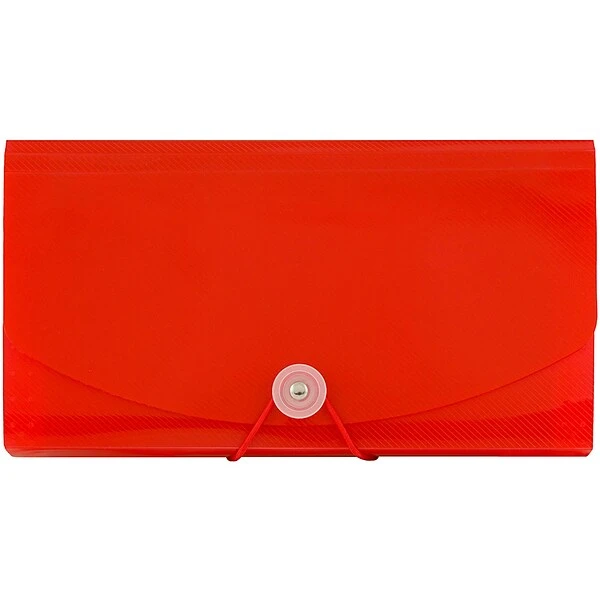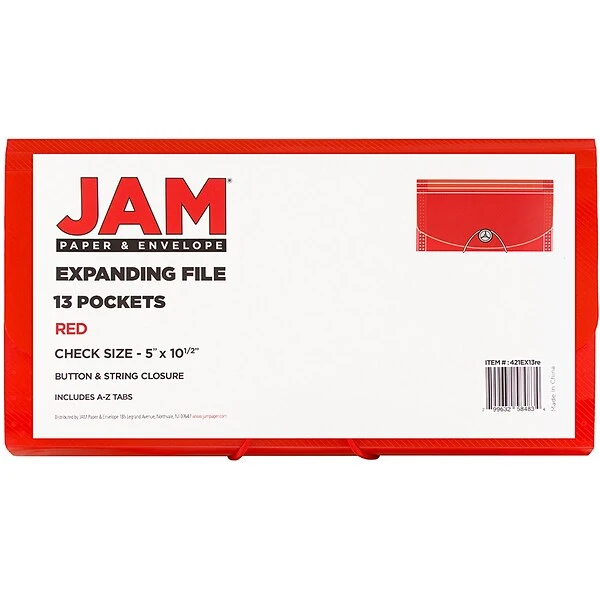 Banish your disorganized ways with this JAM Paper 13 Pocket Expanding File with Button & String Closure! These files are truly amazing to store smaller papers due to their standard check size. They measure 5 x 10 1/2 inches, so they are perfect to hold receipts, coupons, business cards, cash, checks and more. This particular file is bright red so losing track of it is virtually impossible. It can be spotted at the bottom of a purse or buried deep inside a drawer. These files are made of durable and strong plastic so everything inside is protected. They also feature a button and string closure so they close securely and can be manually opened with ease. Be assured that nothing is falling out of these files. They also feature 13 pockets, so you can store a variety of different documents and materials inside. They are sold individually. Size: 5 x 10 1/2 inches | Color: Red | Quantity: Sold Individually