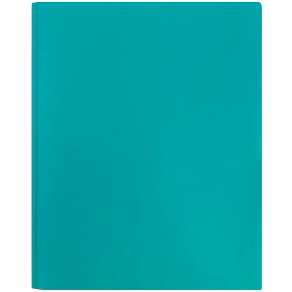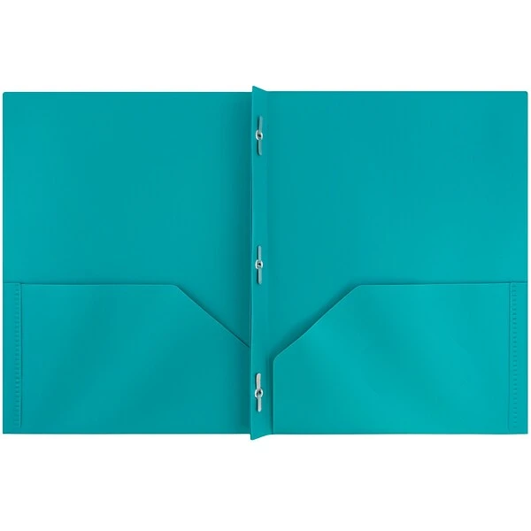 JAM Paper® Teal Plastic Eco Two Pocket Presentation Folders with Clasps are 9 x 12 inches in size when closed and are conscientiously manufactured from a sturdy, pliant, plastic material. This unique material provides reliable protection for your stored documents. On the inside, each of these folders contains two pockets and business card slot cut into the surface of the right-side pocket. Going vertically along the inner center, there are three metal clasps and rings for securing 3-hole-punched documents. The vivid, sea breeze teal color of these folders is certain to remind you of a day at the beach while you are going through paperwork and tasks and work or school. This pack contains a total of 6 folders.