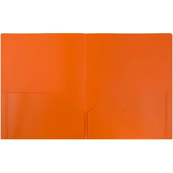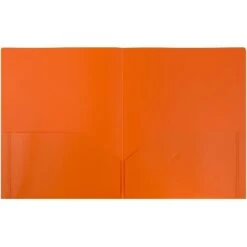 JAM Paper Orange Plastic Eco Two Pocket Presentation Folders are made out of innovative , earth-friendly plastic and have a smooth, pliable texture. This pack comes complete with a total of 6 folders! Each one measures 9 x 12 inches, just a little larger than most standard sized documents. Each one has two pockets on the inside with a business card slot in the right side pocket. Their striking orange color helps them stand out among the rest of your school or office supplies to help you find your stored documents quickly and easily! Maximize your organization, brighten up your space, and be kind to the environment with these orange folders!
