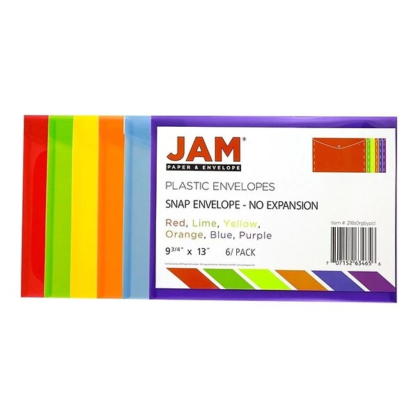 Enjoy the lightweight portability of these plastic assorted-color snap-closure envelopes. The plastic material resists scratches and water, while the translucent design lets you see what’s inside the envelopes without having to open them. These JAM Paper plastic snap-closure envelopes come in six assorted shades, so they’re great for color-coding, and the snap-closure design offers quick access to contents.
