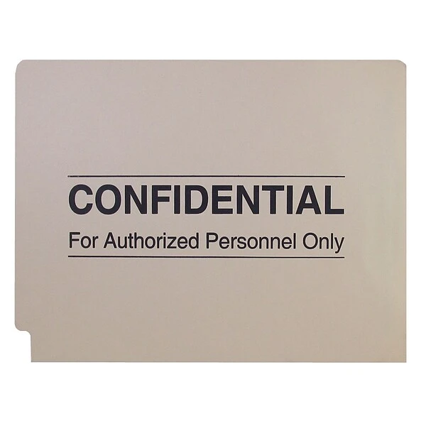 Sturdy 14 pt. manila folder features CONFIDENTIAL warning on front and back. Double thick, full-cut end tabs with embossed score lines. Preinstalled fasteners in positions 1 and 3. Scored 3/4 inch for expansion. Size: 12-1/4W x 9-1/2H; 11-3/4W body. 50 per box.