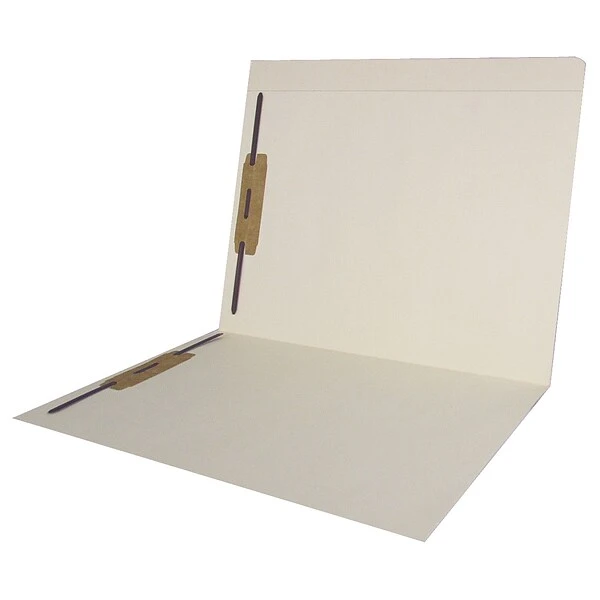 Sturdy 11 pt. manila folders have full cut double-thick top-tabs. Two 2 inch capacity preinstalled fasteners hold 2-hole punched paperwork. Scored for 3/4 inch expansion. Recycled 10% post consumer content.
