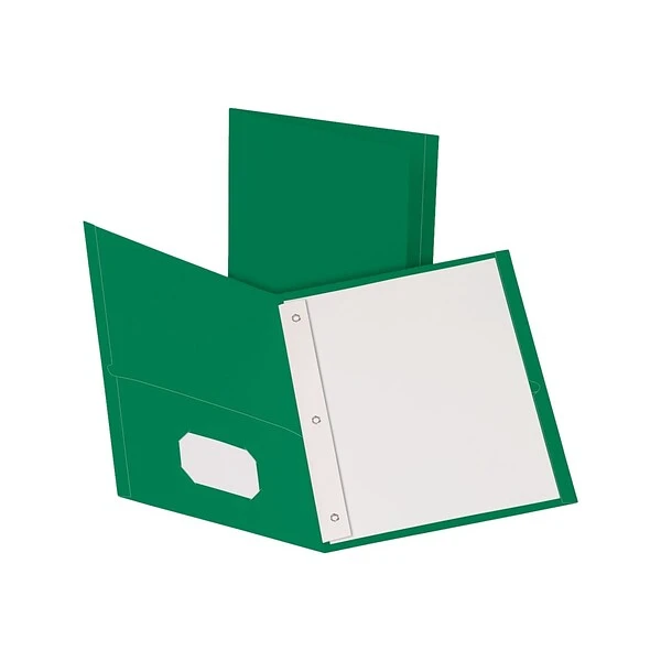 Keep important documents easily accessible with this twin-pocket report cover. The hunter green hue lets you color-code paperwork and notes for easy reference, while the sturdy fasteners hold pages in place. Featuring a die-cut business card hole, this Oxford prong-fastener report cover makes it easy to display your contact information.