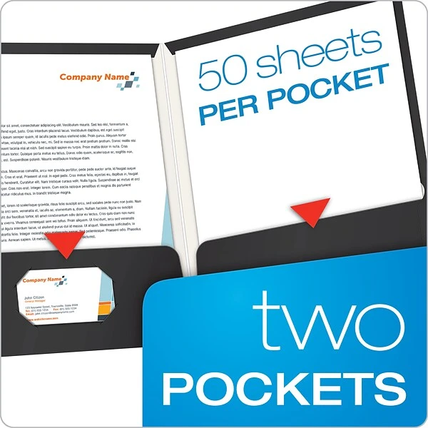 Store project proposals, training materials, and research papers in these laminated portfolios for quick access and organization. Each of these 25 Oxford laminated portfolios features two 50-sheet capacity pockets and one die-cut business card holder, making them perfect for conferences, interviews and conventions.