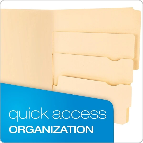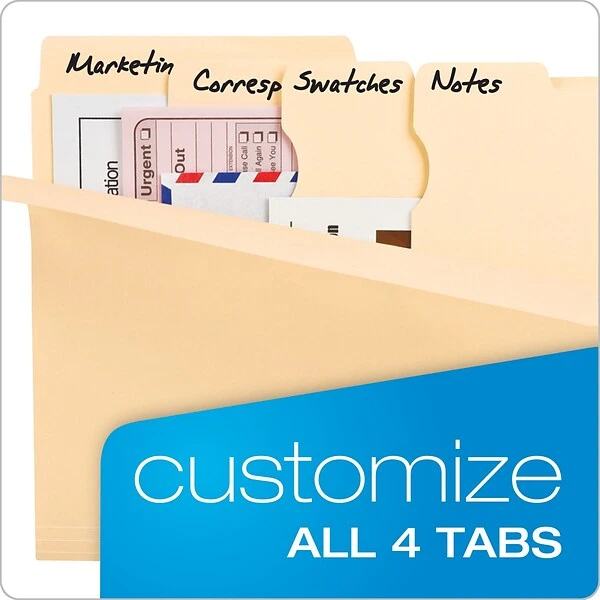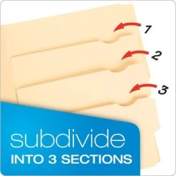 Includes four tabs for easy labeling of both the folder and three subdivisions inside it. The manila paper is durable and easy to write on, making these folders versatile, while the standard letter sizing works with most documents. Resistant to staining and abrasion, these folders are designed to handle the rigors of regular office use.