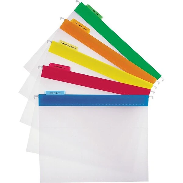 Pendaflex EasyView Hanging Folders allow you to quickly locate exactly the document you need. The clear poly construction also stands up to wear and tear. Each folder has a colorful top for color-coded filing. Letter size. 5 Tab positions. Assorted colors: blue, yellow, red, orange, green. Includes 25 clear plastic tabs and inserts. 25 Per box.