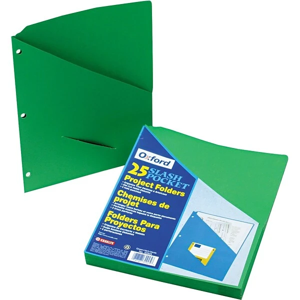 Esselte Oxford Recycled slash pocket project folder in green color features die-cut storage pocket for keeping diskettes/notes/photos/business cards. Folder is 3-hole punched for greater ease and is ideal for office use.