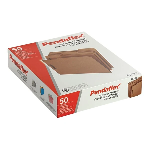 Flip through charts, forms, and other paperwork with these fastener folders. The 1/3-cut tabs provide convenient labeling options, while the sturdy embedded fasteners hold documents in place to prevent page loss. Durable kraft construction and a reinforced tab design offer added strength for long-lasting use. With 50 pieces in each box, these Pendaflex Kraft folders provide an ample supply to redo your filing system.