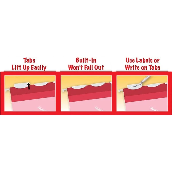 Pendaflex Ready-Tab hanging folders feature 3 built-in tabs for faster file setup. Simply lift the tab in the position you need. Includes a printer-ready sheet of adhesive labels. Reinforced top edge and bottom fold for additional durability. Letter size. Assorted colors.
