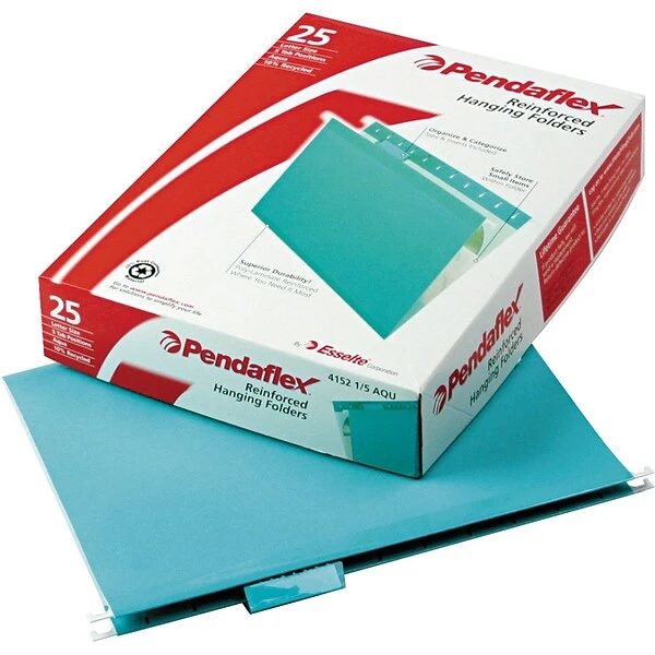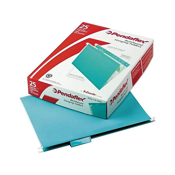 Locate important reports, medical forms, and other various documents quickly with these reinforced hanging file folders. The included inserts make it easy to create labels, while the five-tab positions allow you to easily customize title placement. These Pendaflex letter-size hanging file folders are aqua for convenient color-coding and feature poly laminate reinforcements on the top and bottom for increased strength and longevity.