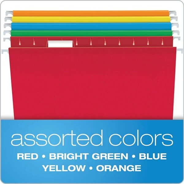 - Letter-sized file folders in bright green, blue, orange, red, and yellow for general or color-coded filing