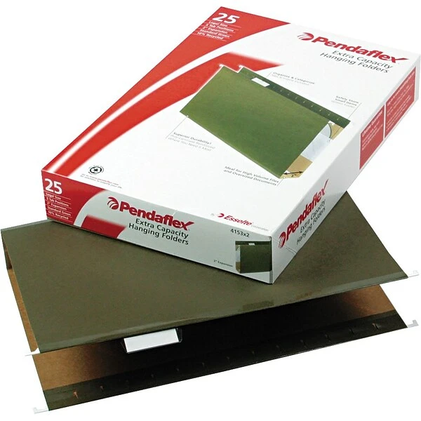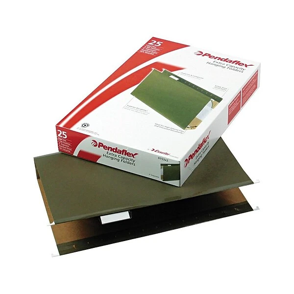 Store stacks of papers up to 2-inch thick with these four extra-capacity hanging pockets. The 11-point cover material keeps items inside protected, and the standard-green color looks professional. Strong rods with longer plastic hooks and built-in tension springs ensure these Pendaflex legal-size hanging folders easily slide and stay on track in your file cabinet.