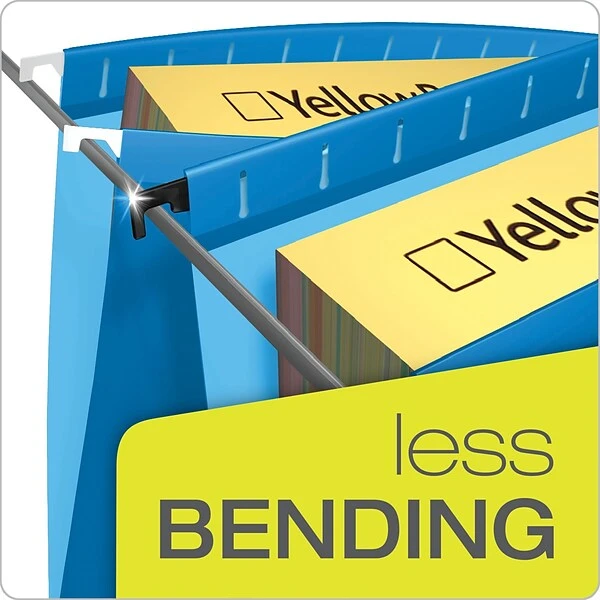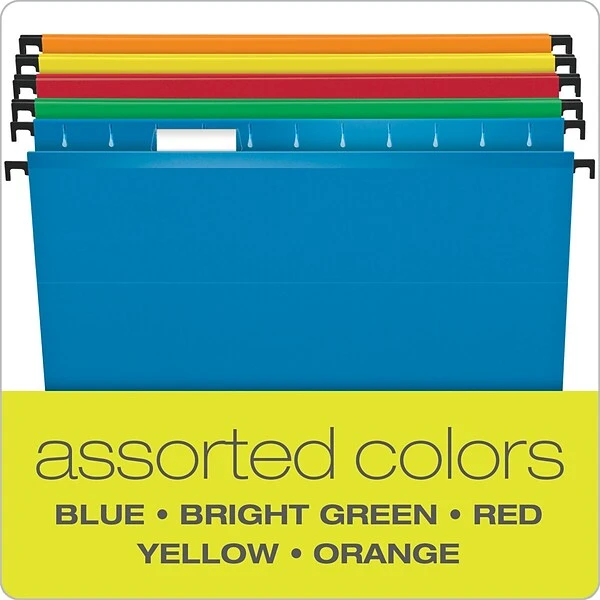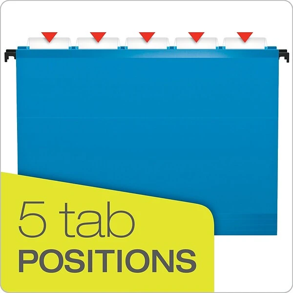 Pendaflex SureHook multicolored five-tab letter-sized hanging folders expand your document storage options with a five-color system instead of a tri-color pattern. Built-in tension springs combine with longer plastic hooks to prevent them from falling into file cabinet drawers, while 11-point weight fiber material withstands everyday use by having extra durability.