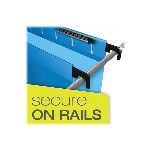 Pendaflex SureHook reinforced hanging box files feature super-strong hanging rods with longer plastic hooks and built-in tension springs so files stay on track, slide more easily, and don’t buckle under pressure. Closed, 2″ capacity tear-resistant sides prevent documents from slipping out (reinforced insert included for stabilization). Includes 25 clear, repositionable tabs and inserts for placement in 5 tab positions. Blue. Letter size, 25/Box.