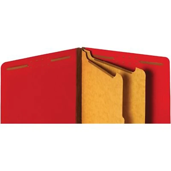 Help employees tackle mountains of paperwork with partitioned folders. Two 17-pt. brown kraft partitions rest between the ruby red 25-pt. pressboard covers, with six total fasteners to secure paperwork. Employees can organize up to 2 inches of papers in the expandable folders with the embedded fasteners on the covers. Use the red exterior as part of a color-coding system to organize different types of paperwork. A 3/4-inch undercut end tab gives a full view of labels for increased efficiency when searching for the right folder.