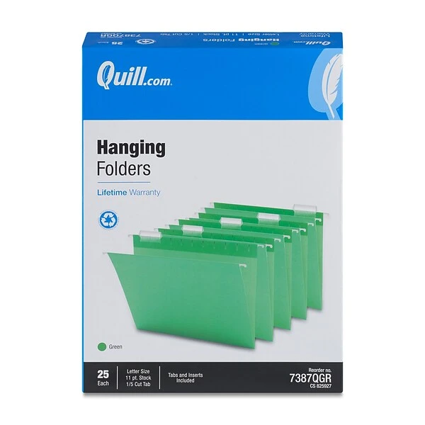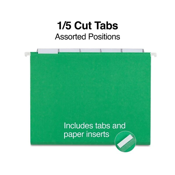 Find the right file quickly in a color-coded drawer with these Quill Brand hanging file folders, which come in a vibrant shade of green. The included tabs and inserts make it easy to label each folder.
