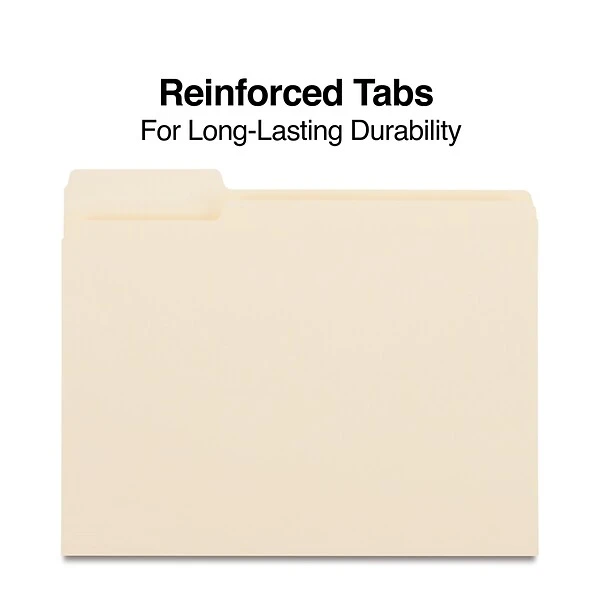 Quill standard manila file folders keep important documents safely filed away and loose papers in a single location. The tabs provide a convenient way to label the file folders for quick reference. The folders’ standard letter size means that most documents fit in them without wrinkling or bending the corners, and the medium-weight material of the folders holds up through active use.
