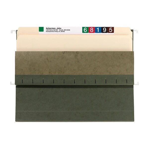 Ensure documents stored in lateral file drawers are easy to find with these Smead hanging box-bottom folders. The metal hooks attach securely to hanging drawer frames, while the reinforced edges stand up to frequent use. Each folder features a 3-inch expansion, making it easy to file away brochures, catalogs, and bulk documents. These Smead hanging box file folders are crafted from sturdy 11-point stock for strength and durability.