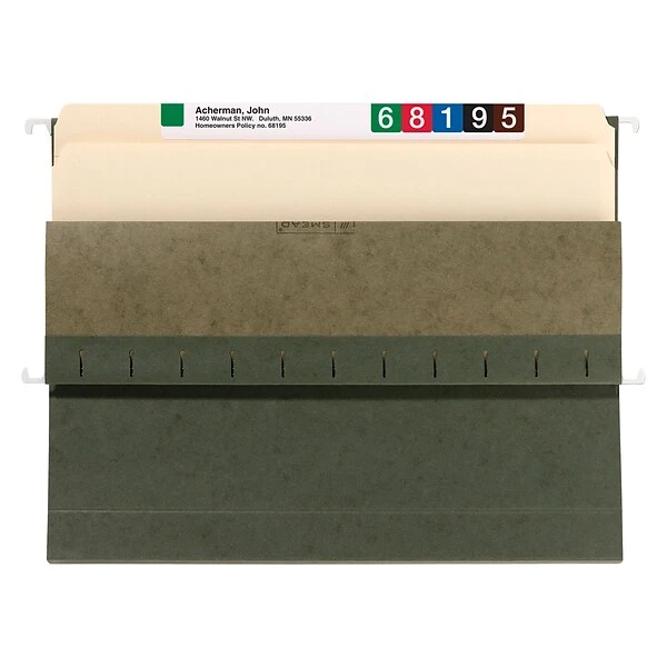 Ensure documents stored in lateral file drawers are easy to find with these Smead hanging box-bottom folders. The metal hooks attach securely to hanging drawer frames, while the reinforced edges stand up to frequent use. Each folder features a 3-inch expansion, making it easy to file away brochures, catalogs, and bulk documents. These Smead hanging box file folders are crafted from sturdy 11-point stock for strength and durability.