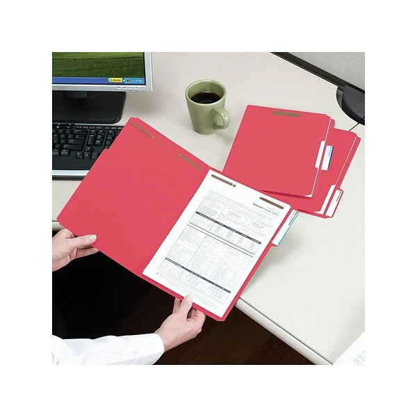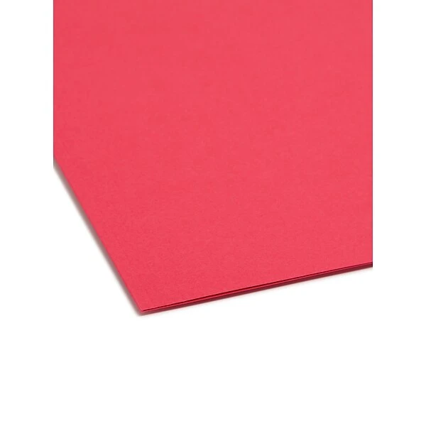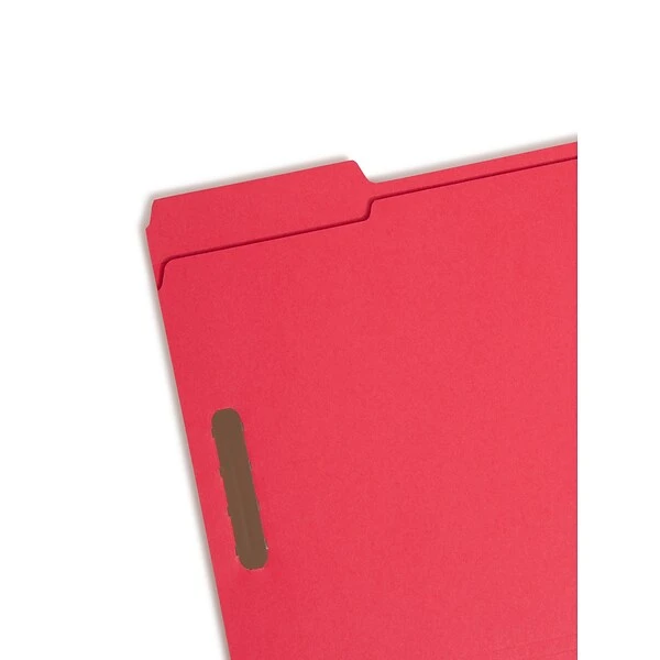 Improve organization with these red reinforced-tab file folders. Featuring two fasteners, these folders can hold up to 0.75 inches of material and easily secure policies, contracts and other document sets and let you quickly refer back to past forms. These Smead 1/3-cut-tab file folders come in a vivid red color, making color-coding important files convenient.