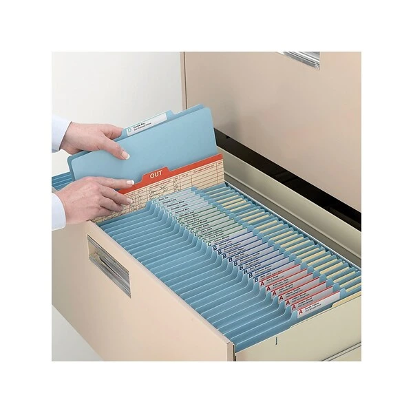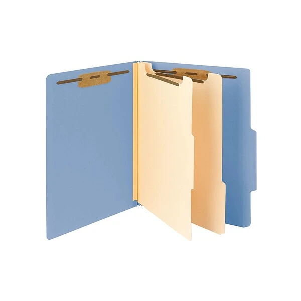Keep papers organized with these letter-size classification file folders. Each one comes with fasteners on the back and front panels, and the dividers provide multiple different filing surfaces, making it easy to keep documents in sequential order. These Smead 2-inch-expansion two-divider classification file folders come in a bright blue, so you can quickly identify important files.