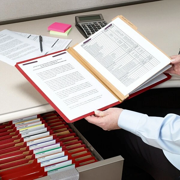 - Bright red 23 pt. pressboard cover with two fiberboard dividers