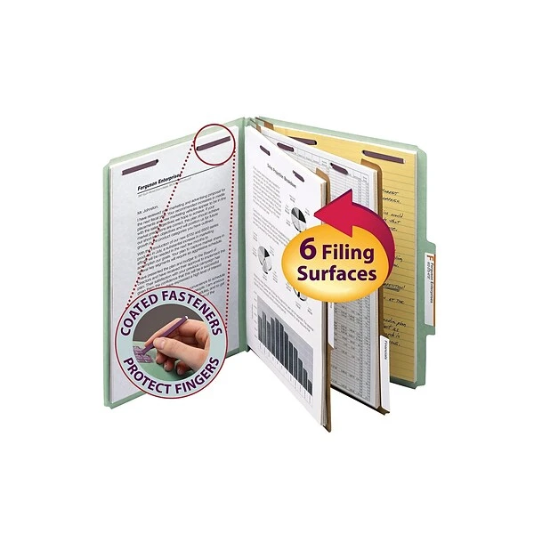 Keep documents secure and organized with Smead classification file folders. The 2-inch expansion supplies ample storage space for large files, and each folder contains two dividers to provide four filing surfaces. SafeSHIELD bonded fasteners protect paper from tears or wrinkling and prevent paper cuts. These Smead classification folders are sourced from certified managed forests so they are an environmentally conscious choice.