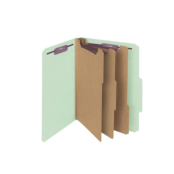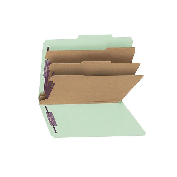 Organize sensitive information in these gray and green Smead pressboard classification file folders. The SafeSHIELD fasteners prevent pages from falling out, and multiple sections let you separate data by date, account, or other types. Coated top fasteners in these Smead pressboard classification file folders reduce snags and accidents, and the folders come in a package of 10, which makes it easy to keep extras for a busy office.