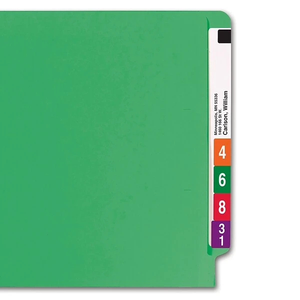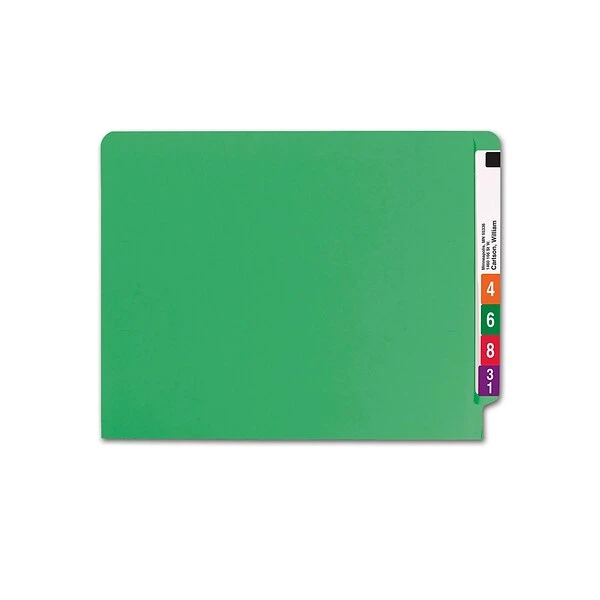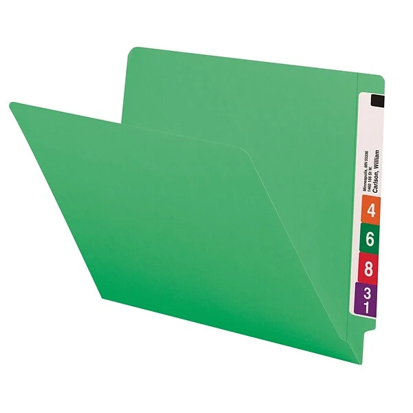 Organize medical, legal or financial paperwork with these Smead Shelf-Master end-tab file folders. The green hue lets you add a color-coding component to your filing system, while the reinforced tabs resist bending and tearing. Straight-cut end tabs provide ample room for longer, detailed labels. With acid-free construction, these Smead Shelf-Master end-tab file folders are ideal for long-term document storage.