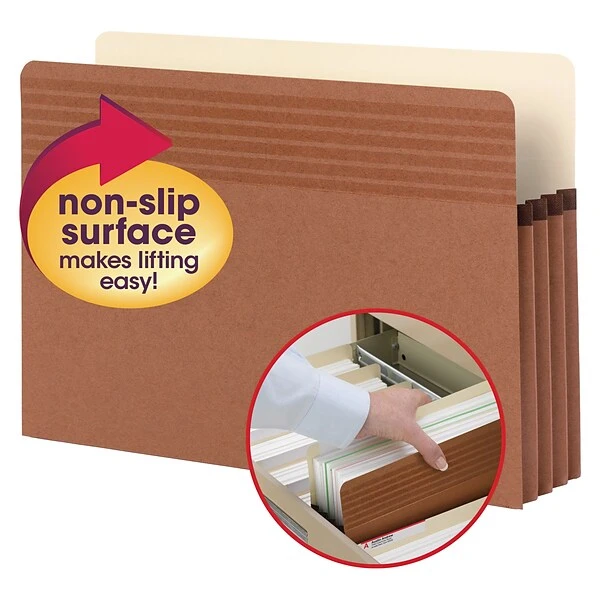 Keep bulk reports, forms or other paperwork neatly organized in file drawers with these legal-size file pockets. Nonslip grips near the tops make these pockets easy to carry, even when full. The Tyvek-reinforced gussets stand up to frequent handling, while the expandable design holds thick stacks of paper. These Smead expanding file pockets come with full-length straight-cut tabs for convenient labeling options.