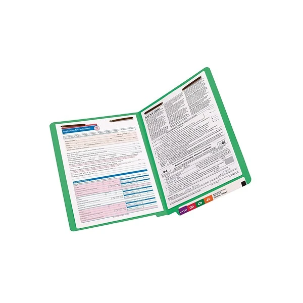 Browse through documents easily with these letter-size green file folders. The two fasteners hold papers securely and let you split documents into separate groups, while the green coloring makes these folders a great addition to a color-coded filing system. These Smead Shelf-Master file folders come in a pack of 50 and have straight-cut tabs that provide plenty of space for labeling.