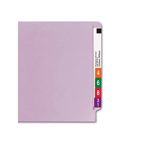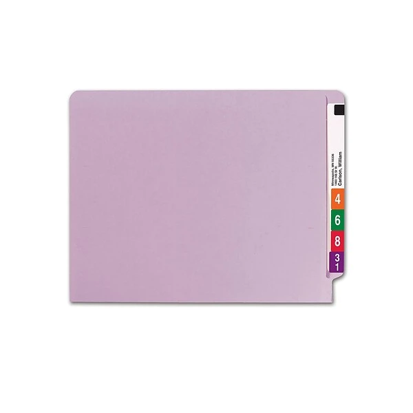 Color-code documents with client details, specific dates and other important information by using these letter-size lavender file folders. Made from sturdy 11-point acid-free stock, these folders are ideal for long-term preservation of policies, manuals and other papers. These Smead Shelf-Master straight-cut tab file folders have a double-thick tab, providing increased strength and durability for long-term, repeated use.