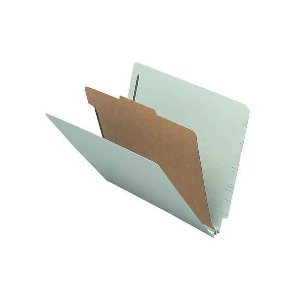 Present documents with a professional touch using these Smead letter-size pressboard classification folders. The center divider provides additional options for organizing paperwork, and each of the four interior surfaces come with SafeSHIELD coated fasteners to prevent paper from falling out. The gray/green hue and end-tab layout make these Smead letter-size pressboard classification folders ideal for use in color-coded shelf filing systems.