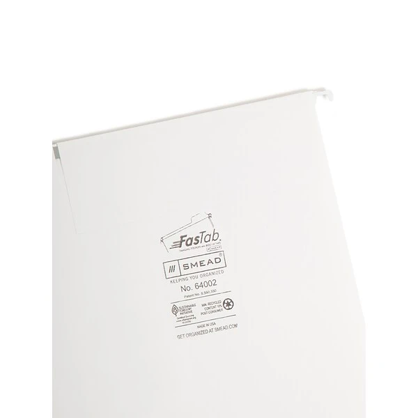 The Smead FasTab hanging file folder has built-in reinforced tabs – no assembly required. It is easy to label by either handwriting directly on the tab or applying self-adhesive labels.
