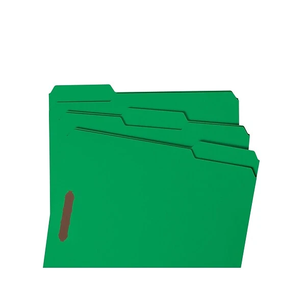 Keep pages securely in place with these fastener folders. The embedded fasteners let you organize and flip through documents, while the 1/3-cut-tab layout makes it easy to add subject labels. Durable 11-point stock construction and a reinforced tab design stand up to frequent wear and tear. With a 50-count package, these Smead letter-size folders provide an ample supply for a busy office.