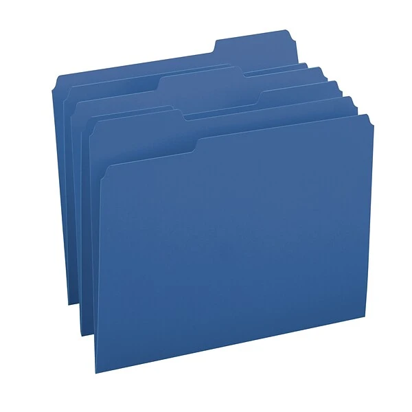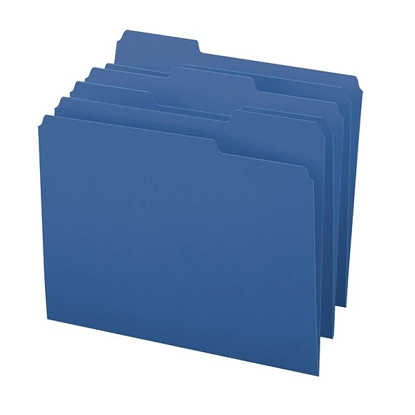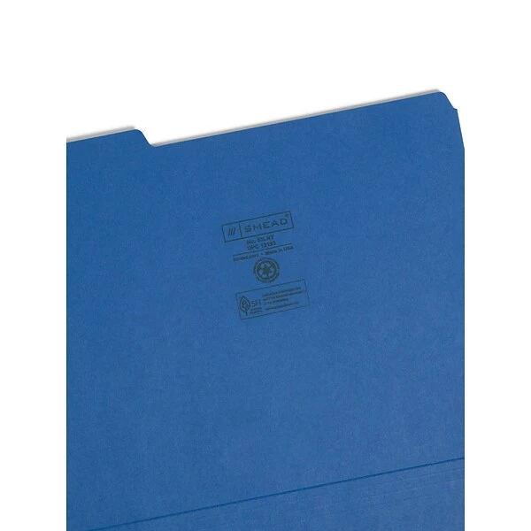 Create a color-based filing system with these Smead letter-size file folders, which feature a rich navy blue hue. The 1/3-cut tab design in assorted positions ensures each label is easy to see, while the rounded corners prevent catching or tearing. These Smead letter-size file folders come in a 100-count package, providing an ample supply to revamp your file cabinet drawers.