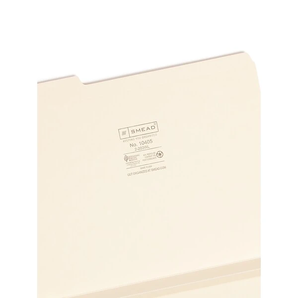 Manage large files and organize documents with this 50-count box of Smead file folders. The 14-point manila material protects and contains files to transport in or out of the office, and the 1.5-inch folder expansion supplies plentiful storage space for multiple documents in each folder. Reinforced tabs on these Smead file folders provide extra durability for long-term daily use.