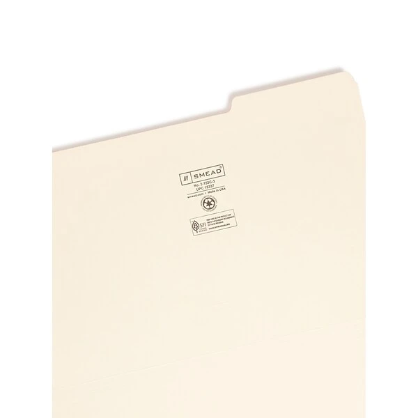 Revamp your file cabinets with these Smead legal-size manila file folders. A reinforced tab design resists bending and folding, while the 1/3-cut right-position layout ensures all tabs remain neatly aligned in cabinet drawers. The standard thickness paper stock construction make these folders ideal for everyday use. These Smead legal-size manila file folders come in a 100-count box, providing a convenient way to add new clients or departments to your filing system.